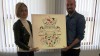 Alberto Canales Díaz entrega a la alcaldesa del municipio, Verónica Samperio, su particular visión del escudo, que ha plasmado en un lienzo, donde sus habituales figuras geométricas comparten protagonismo con sus no menos populares colores, impregnados en la tela, a través del rotulador